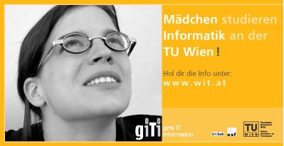 Um den Frauenanteil an den StudentInnen zu erhöhen, informierte WIT mit dem Projekt giTi Maturantinnen über die Ausbildungsmöglichkeiten im IT Bereich an der TU Wien. Da mit der Initiative FIT (Frauen in die Technik) in Wien bereits ein langjähriges und gut funktionierendes Berufsorientierungsprogramm bestand, arbeitete WIT bei Verfolgung dieser Ziele eng mit dem Team von FITwien zusammen. Im Rahmen von FITwien wurde bei den Schnuppertagen an der TU Wien im Jänner 2004 daher zum ersten Mal ein Informatikschwerpunkt konzipiert. 2005 und 2006 wurde die erfolgreiche Kooperation wiederholt, und auch für 2007 wurde die Zusammenarbeit beibehalten. So konnten die Mädchen den von WIT gestalteten giTi-Tag besuchen und sich dabei umfassend über die Studienmöglichkeiten von Informatik und Wirtschaftsinformatik an der TU informieren. Unter anderem fand dabei ein ausführliches giTi-Schnuppern statt. Dabei stellten verschiedene Arbeitsgruppen der Fakultät für Informatik in mehreren Stationen interessante IT Anwendungen vor. Im Vorfeld der Schnuppertage wurden engagierte Studentinnen der BOKU und der TU eigens als FIT-Botschafterinnen eingeschult, um von November bis Jänner in 2er Teams in Wien und NÖ in die Schulen zu gehen. Aufgabe der FIT-Botschafterinnen ist es, die letzten drei Schulstufen von Höheren Schulen zu besuchen und LehrerInnen und Mädchen über die Berufsorientierungstage an der TU Wien zu informieren. Eine Aussendung des Wiener Stadtschulrats im Herbst, in welcher FIT-Folder und FIT-Poster an alle Schulen verschickt werden, diente ebenfalls der Vorinformation. Mädchen, die an der TU Wien ein Informatik- oder Wirtschaftsinformatik-Studium beginnen, erhielten von WIT weitere Angebote: Erstsemestrige Studentinnen konnten sich beispielsweise in Admina.at -Kursen Hard- und Softwarekenntnisse aneignen oder sich für das Mentoring Projekt big sister.first steps bewerben. Im Vorfeld konnten auch schon Schülerinnen ab 10 Jahren über Admina.at goes school-Workshops PCs von innen kennenlernen. Mit all diesen Maßnahmen wurde das WIT-Ziel angestrebt, mehr Mädchen und Frauen als bisher für das attraktive Ausbildungs- und Berufsfeld der Informatik und Wirtschaftsinformatik zu interessieren. Schließlich ist nach wie vor ein grosser Bedarf an IT Fachkräften in allen Bereichen der Wirtschaft und Verwaltung gegeben und handelt es sich dabei doch um eine der Schlüsseltechnologien der modernen Informationsgesellschaft. Nähere Infos zu den Schnuppertagen und dem FIT Projekt: FITwien.